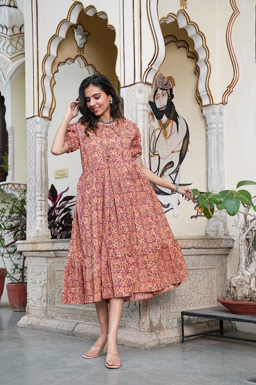 Elevate your everyday look with our RUST ELEGANCE FLARED DRESS , a perfect fusion of ethnic charm and modern comfort. Designed for the free-spirited woman, this breezy cotton dress makes a bold yet graceful style statement.