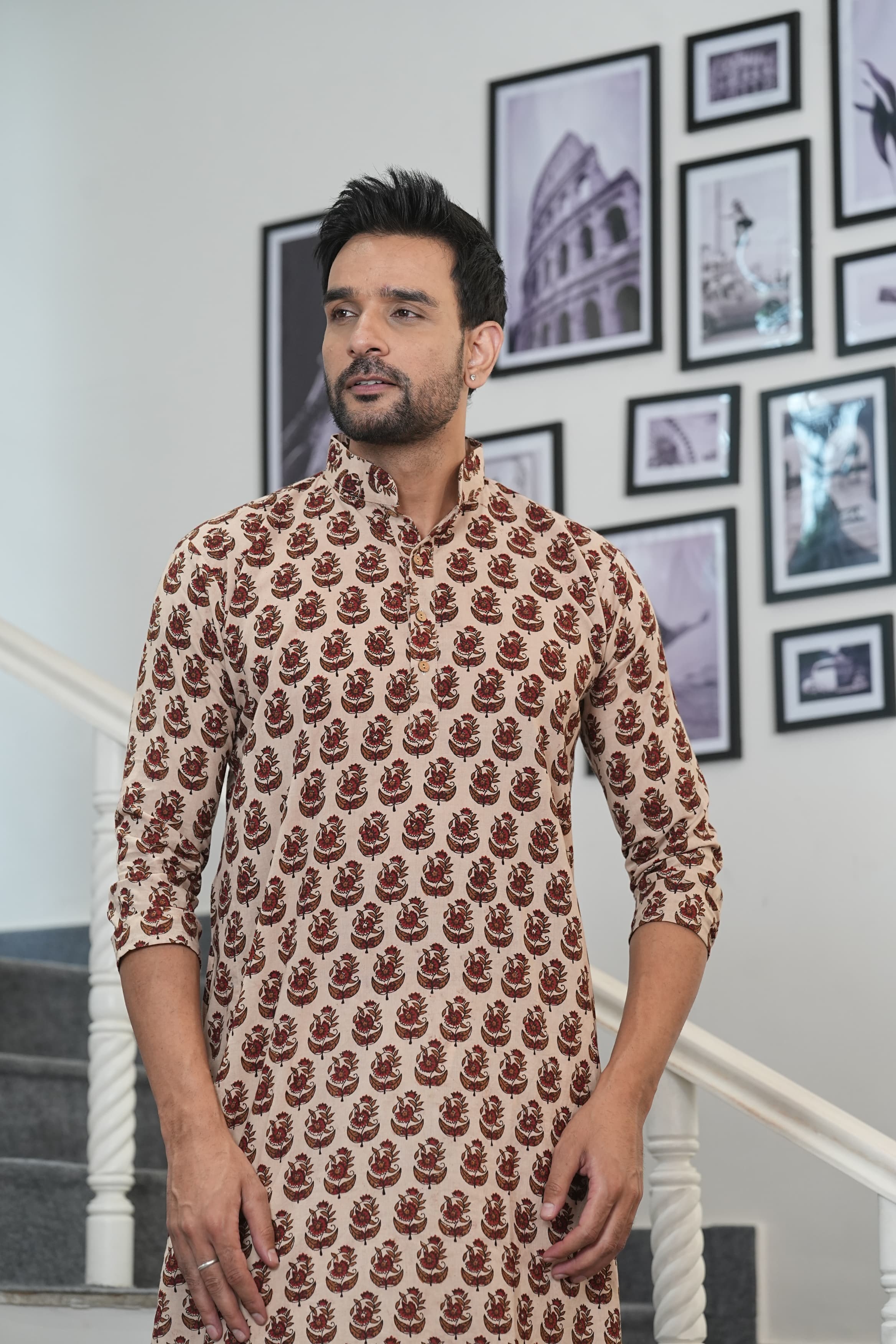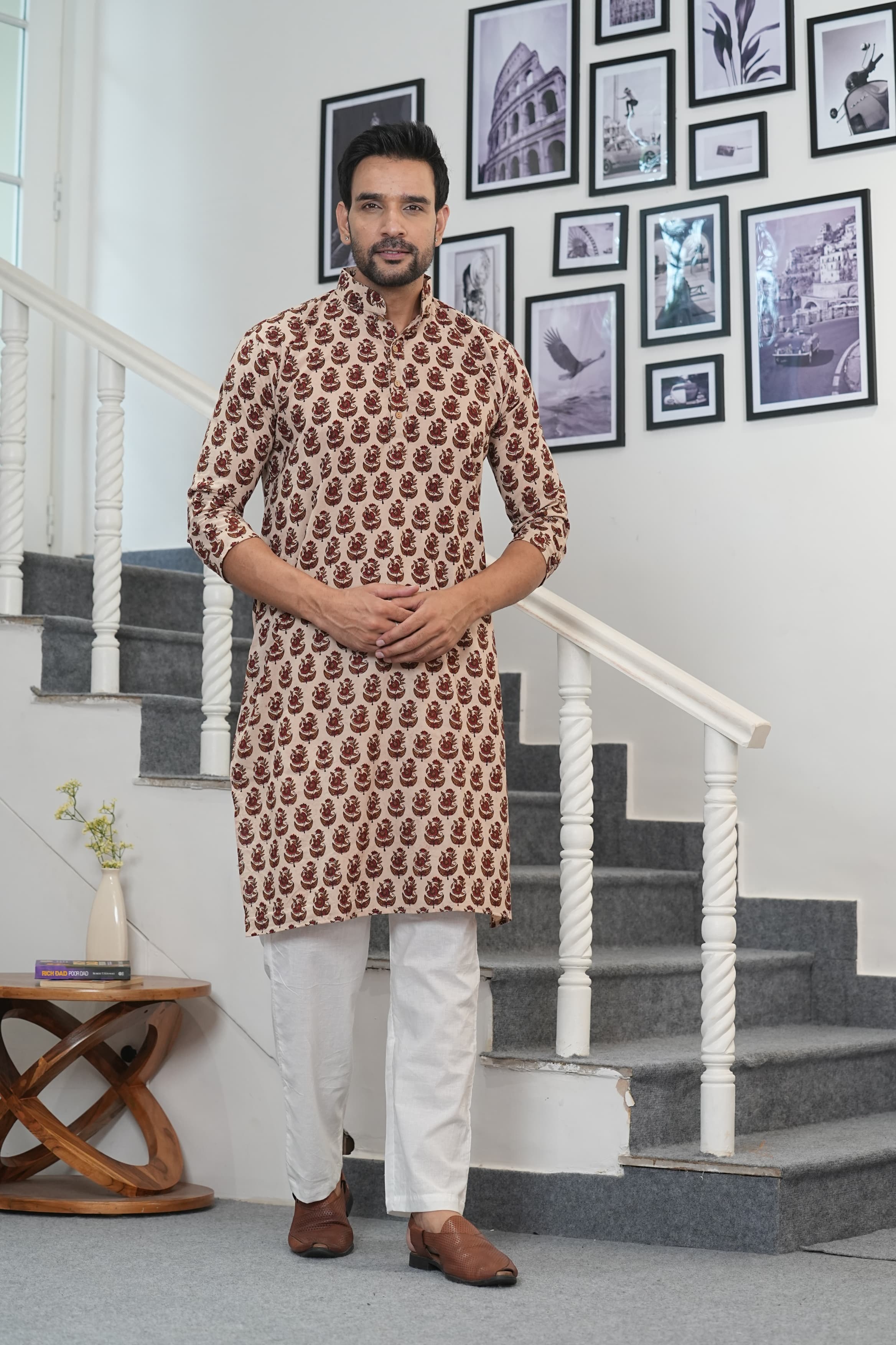 Introducing Sandstone Royale, a timeless kurta crafted in the spirit of India’s rich block printing heritage. Each motif is painstakingly stamped by skilled artisans, transforming soft cotton into a canvas of classic luxury.