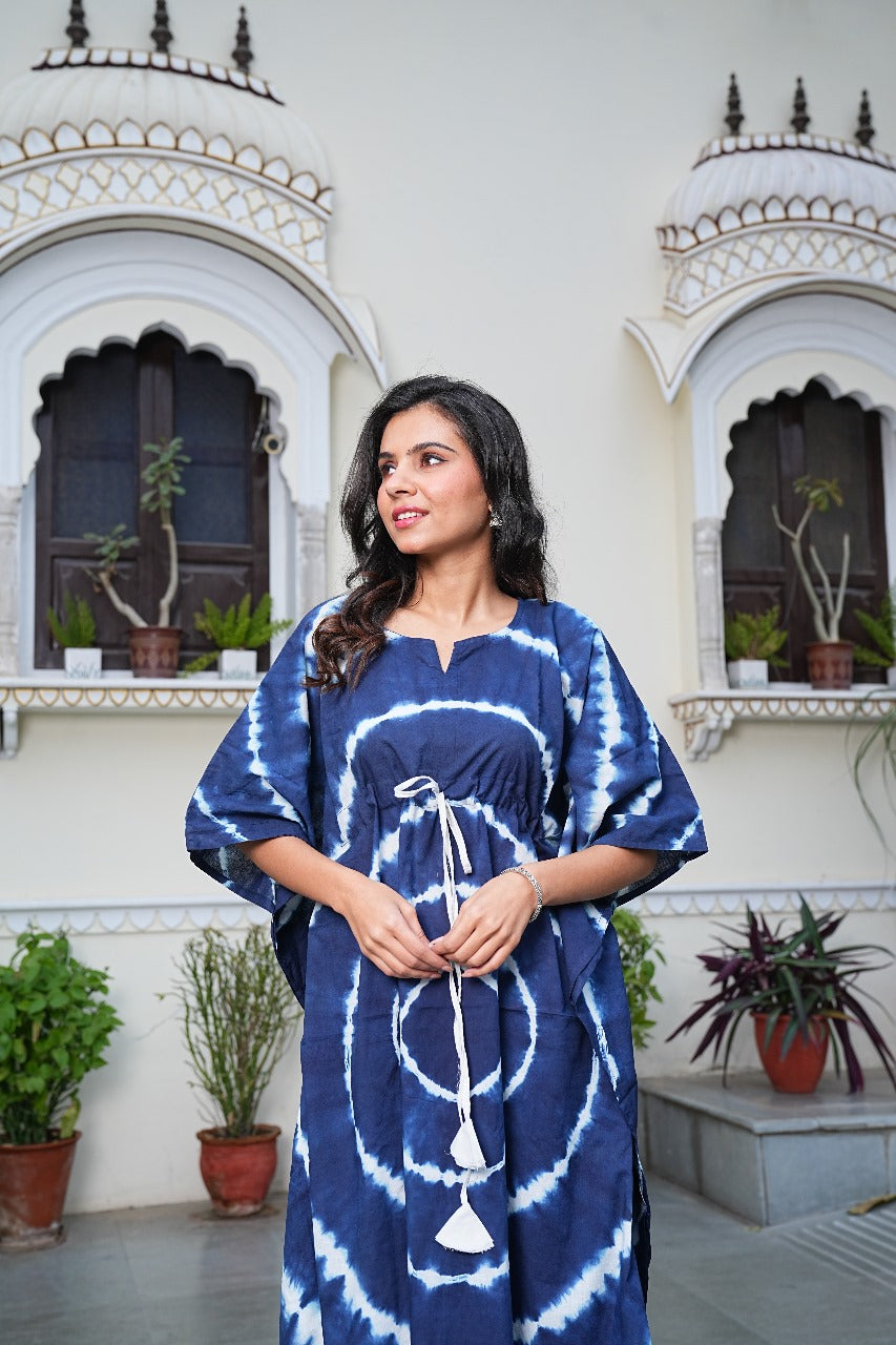 Channel effortless boho elegance with our Shibori Tie-Dye Cotton Kaftan – a timeless blend of tradition and trend. Crafted from 100% breathable cotton, this piece features hand-done Shibori dyeing that makes each kaftan truly one-of-a-kind.