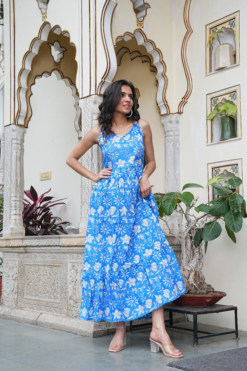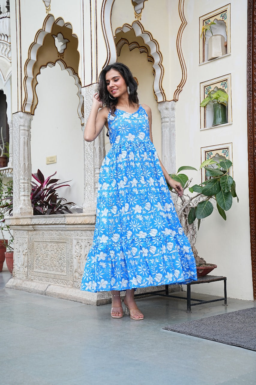 Brighten up your wardrobe with this breezy Sky Blue Floral Hand Block Printed Long Dress, Crafted in pure cotton, this flowy silhouette is designed for comfort and ease, ideal for warm-weather occasions. The floral motifs lend a timeless, handcrafted charm, making it a versatile pick for casual day-outs or resort getaways.