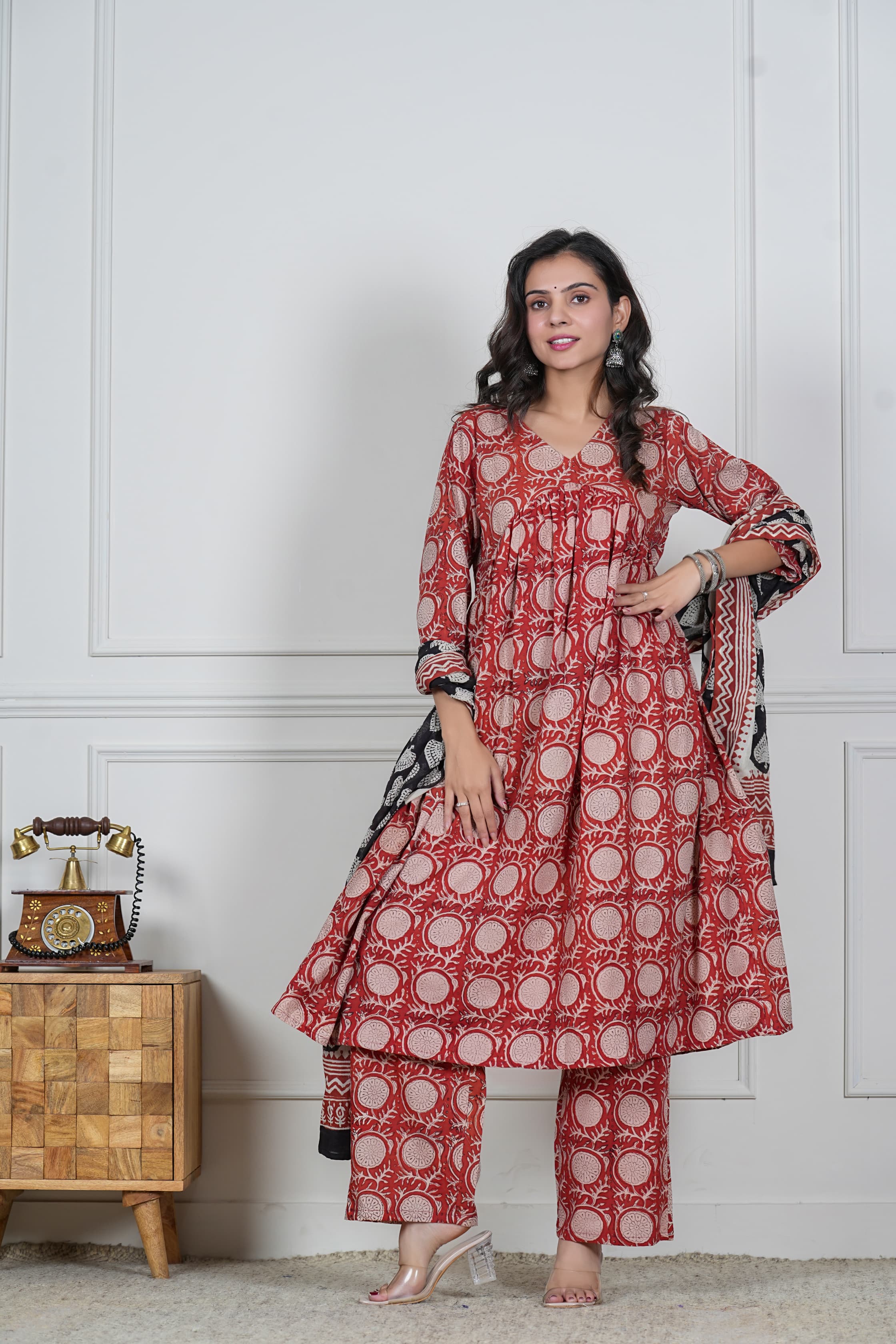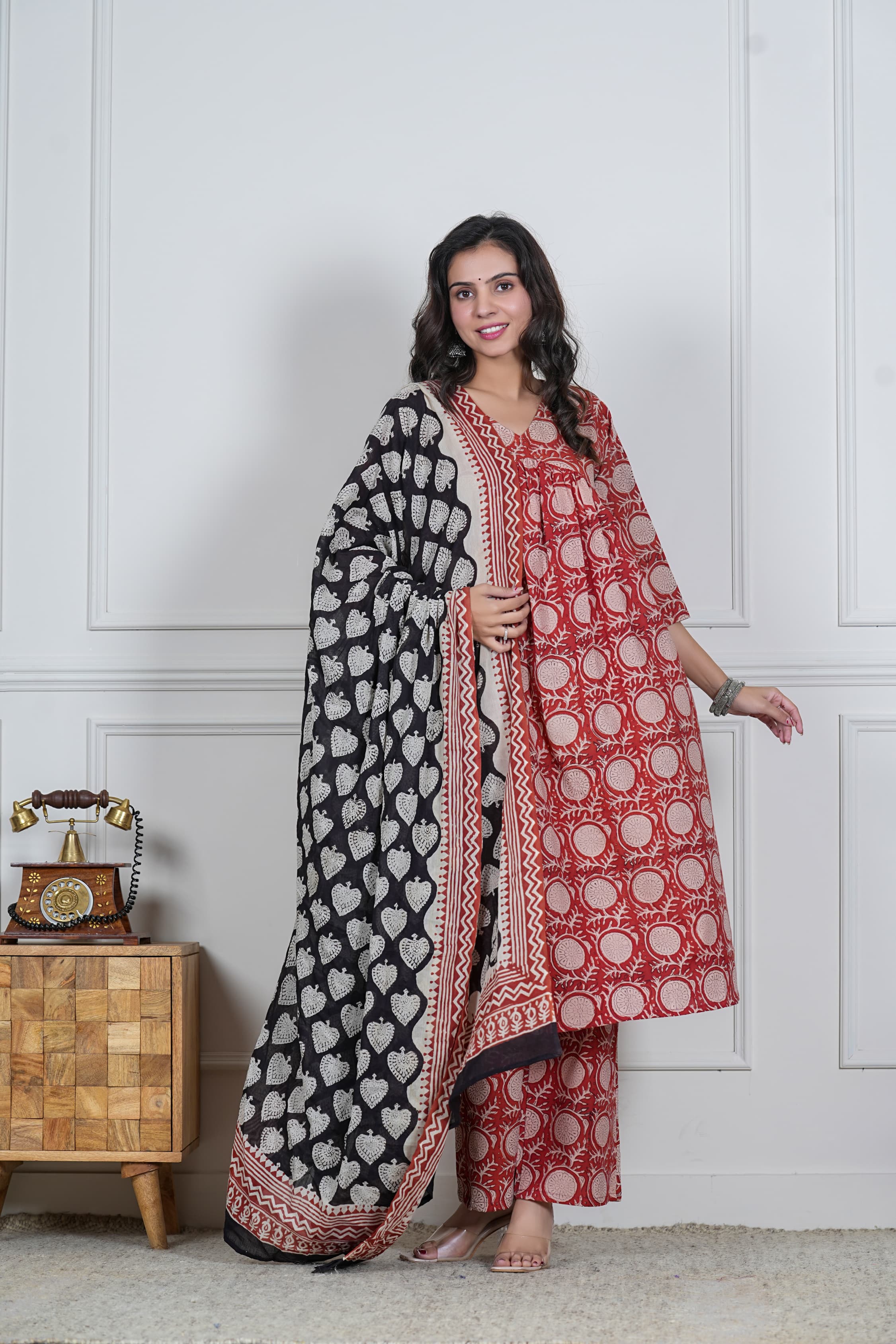 Gracefully rooted in tradition, the Laal Gulmohar set captures the essence of earthy charm and artisanal beauty. The kurta features a striking pomegranate-inspired block print in soft off-white on a rich rust red base, with gentle gathers below the yoke for a flattering fall. Coordinated straight pants and a bold black mul cotton dupatta adorned with white buta prints and ethnic borders complete the look with finesse.