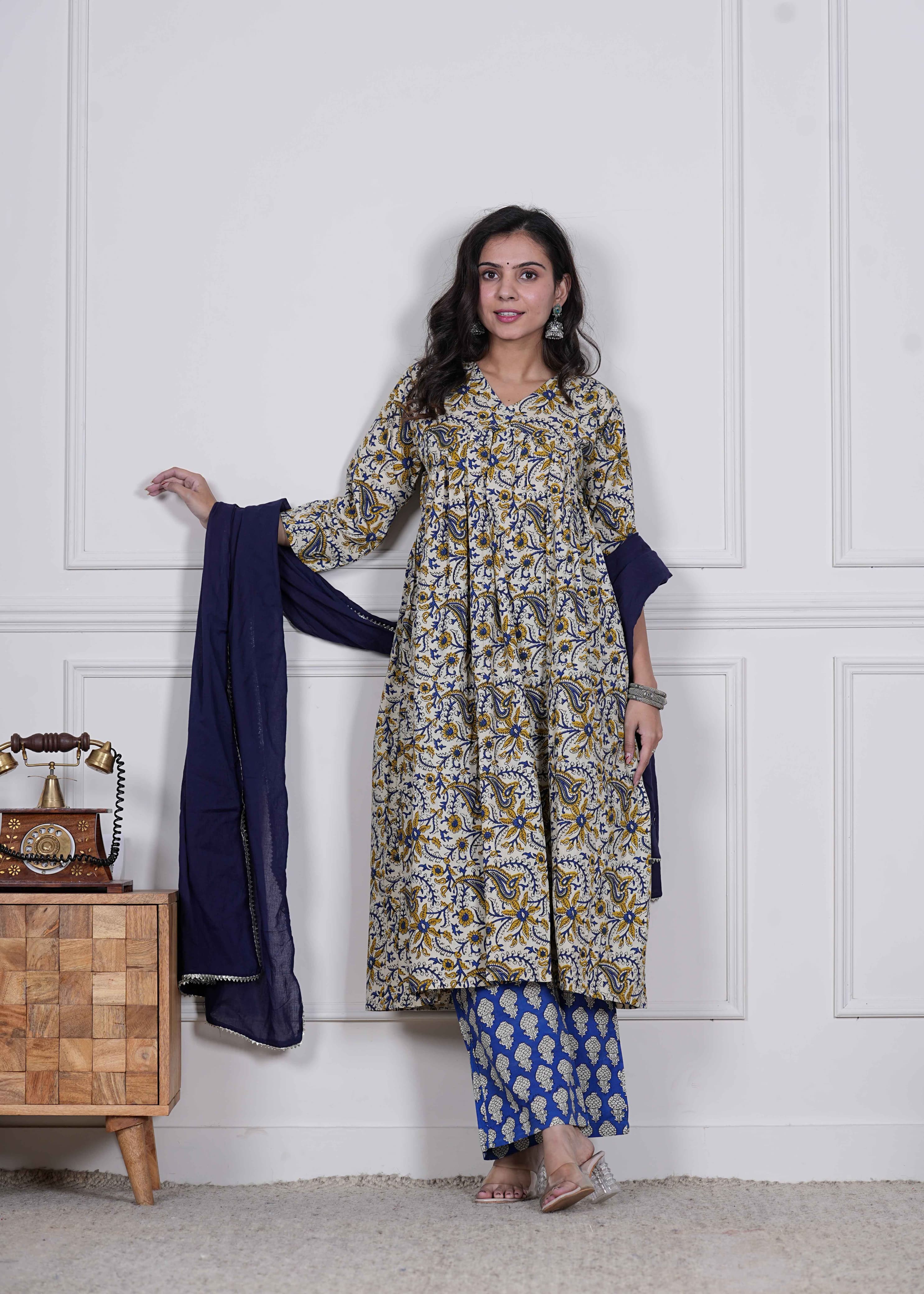 A beautiful blend of tradition and trend, the Sunehri Nazaare set brings sunshine to your wardrobe with its hand block floral motifs in mustard and indigo hues. The kurta features a soft flowy silhouette with delicate gathers and a charming neckline, paired with indigo printed pants and a contrasting solid navy blue dupatta finished with dainty lace edging.