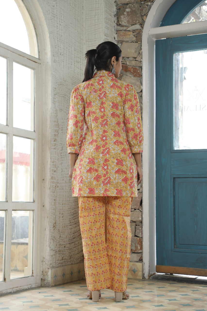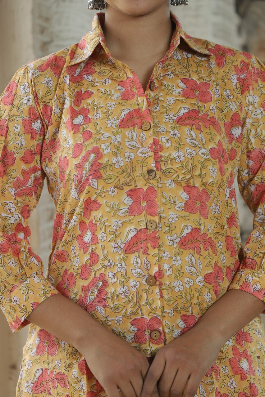 Brighten up your wardrobe with our Sunshine Floral Block Print Co-Ord Set, where traditional art meets modern-day comfort. Bursting with hues of mustard yellow and accented with delicate red and white floral block prints, this ensemble brings joy, freshness, and effortless charm to any occasion.