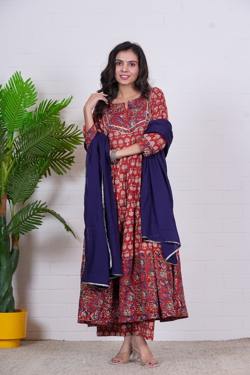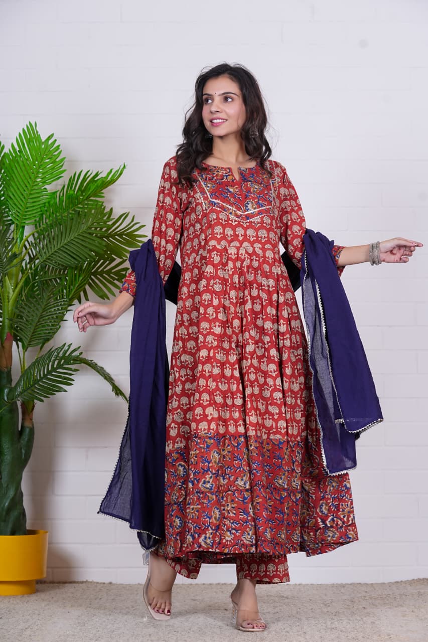 Celebrate timeless craftsmanship with Rudrani, a regal hand block printed cotton Anarkali set in warm rust red hues. The kurta is adorned with intricate tree and floral block motifs, beautifully balanced with a contrasting navy blue dupatta that adds depth and elegance.