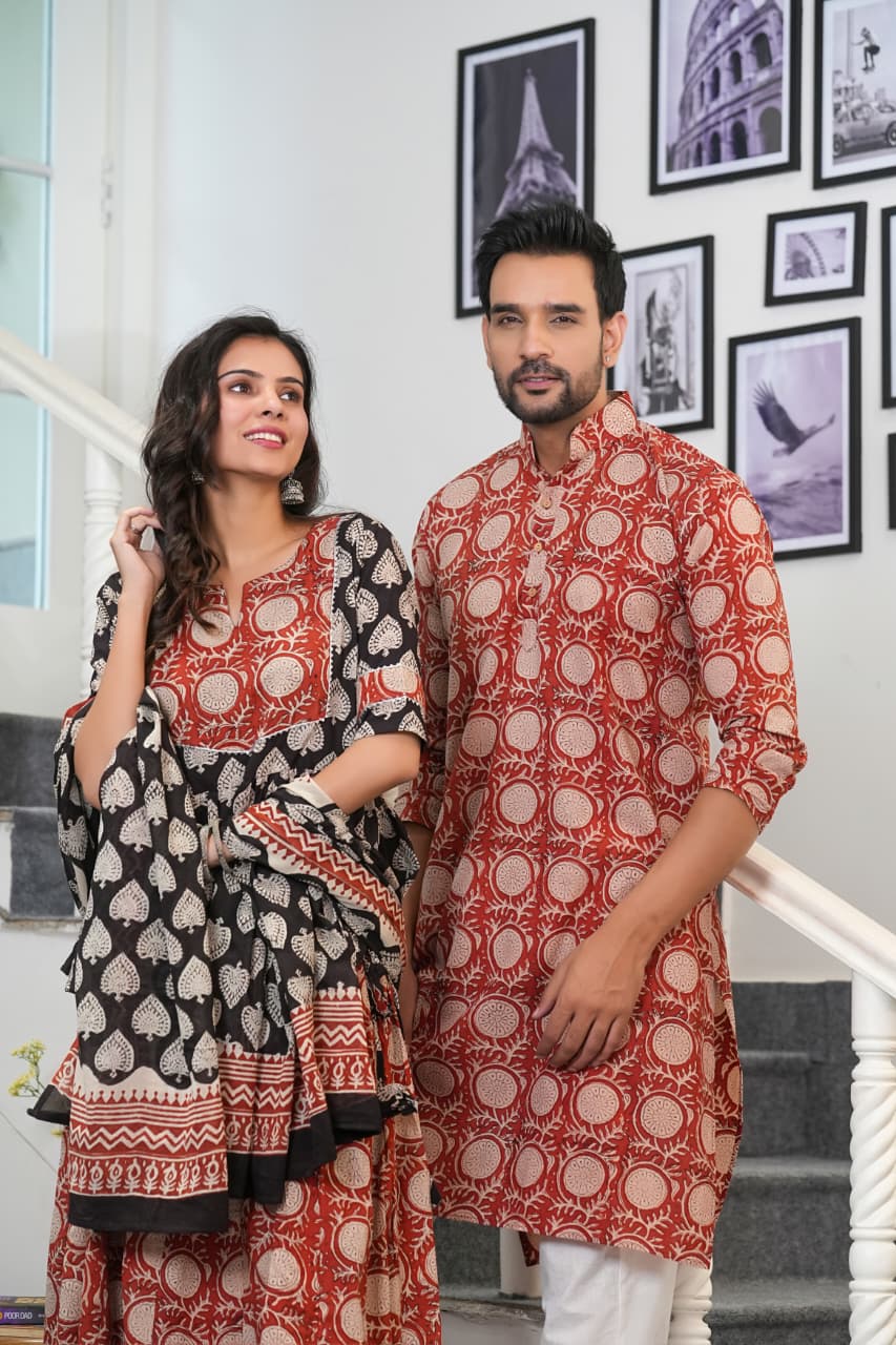 Celebrate togetherness with the Syahi beger - Red Black Hand block Couple Set, where timeless block prints meet earthy elegance. With vibrant rust-red tones, bold hand block motifs and a black contrast twist, this pair is crafted to make you both shine on festive occasions, weddings, and family gatherings.