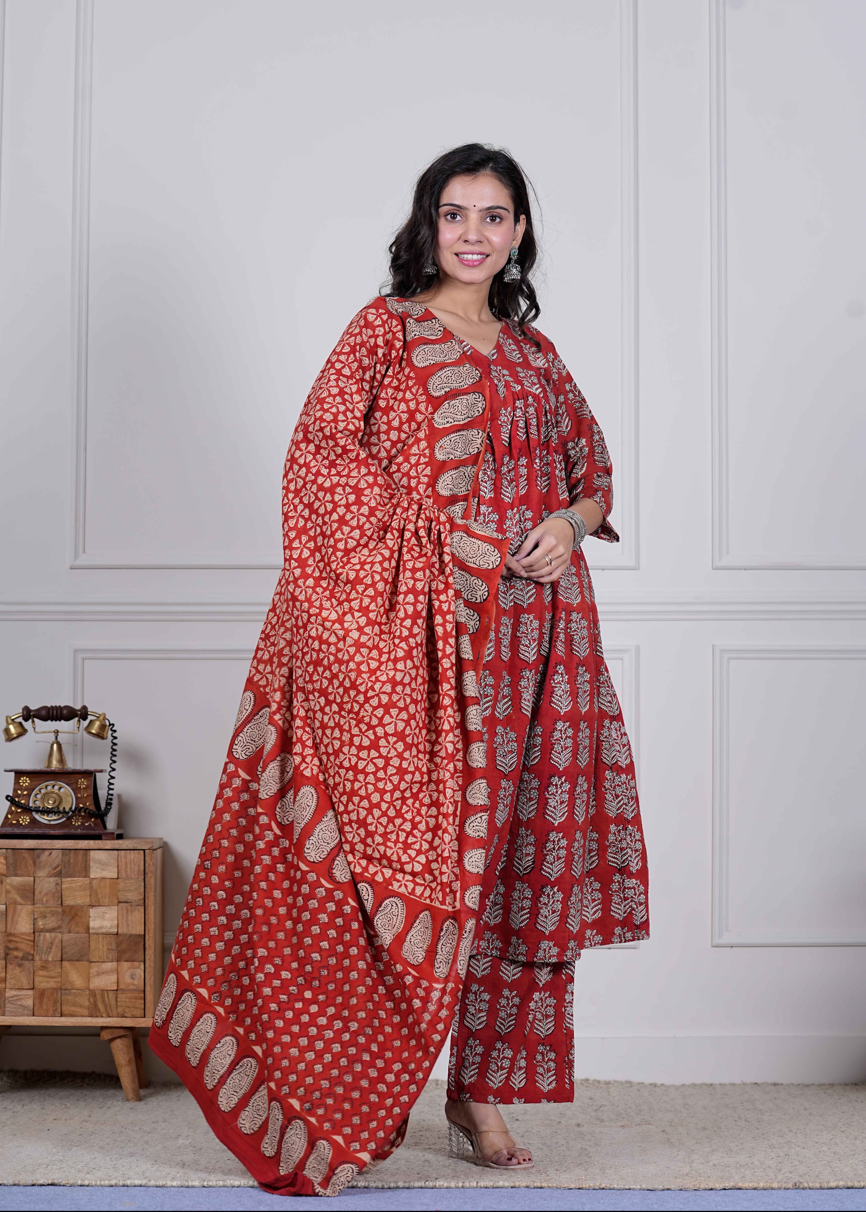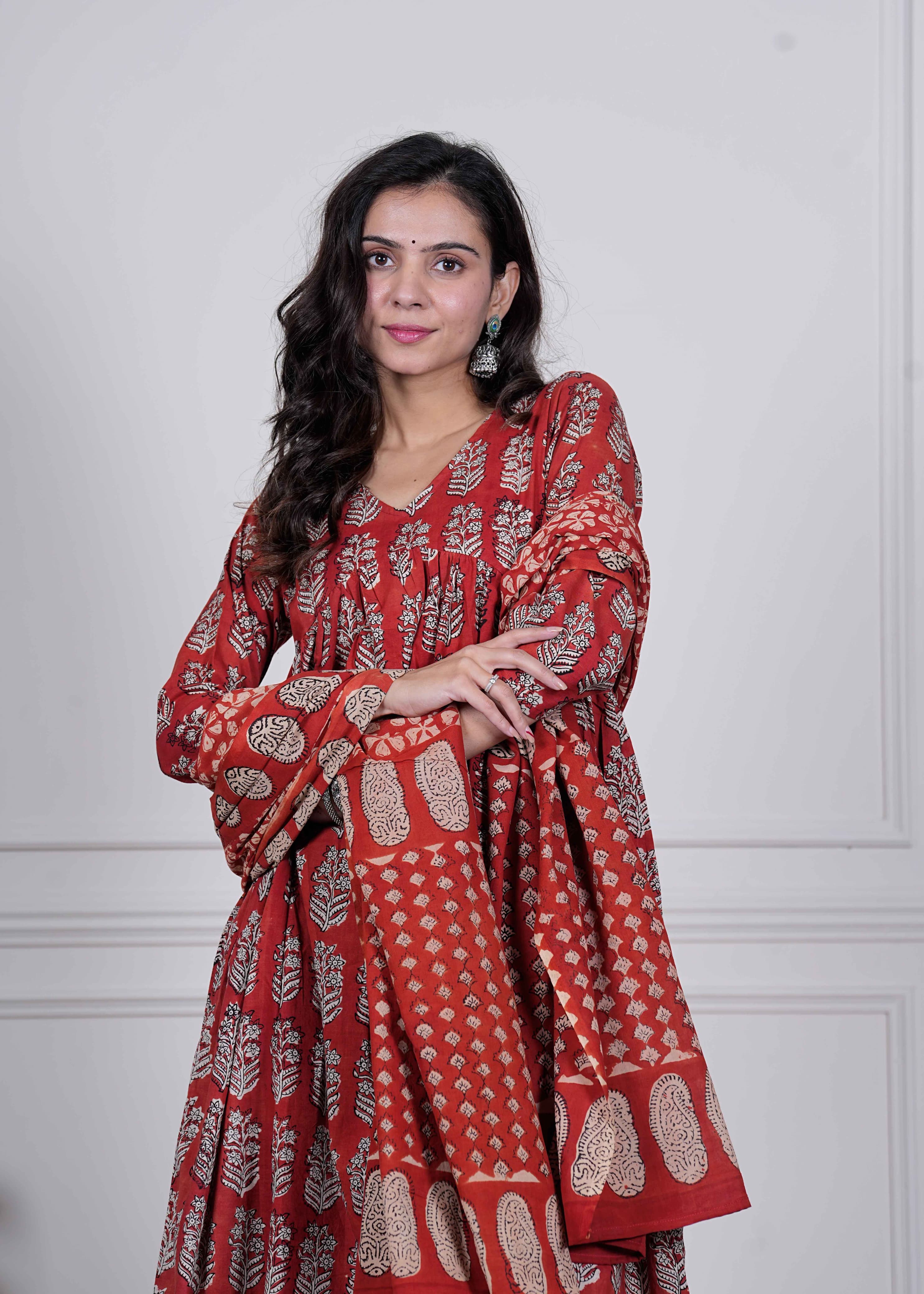 Wrap yourself in earthy elegance with Tamarind Taal, a handcrafted ensemble rooted in tradition. This 3-piece set features a rust red base adorned with beige floral hand block prints, offering a timeless aesthetic that’s both bold and graceful. The gathered A-line kurta, straight-fit pants, and a statement cotton dupatta with intricate border and motif detailing together create a look that speaks of festive ease and cultural richness.