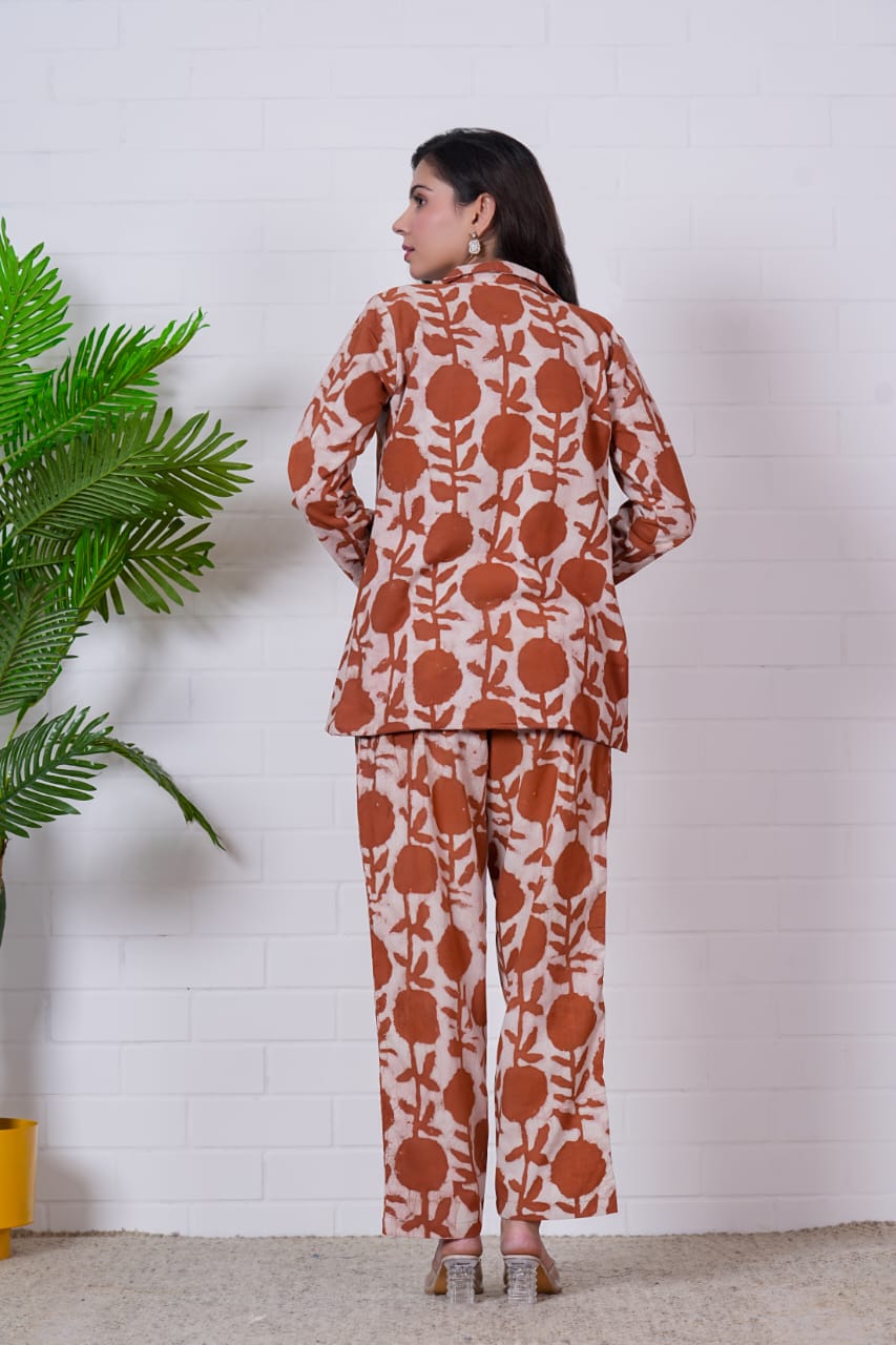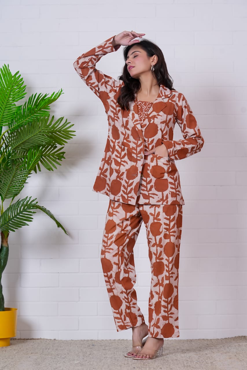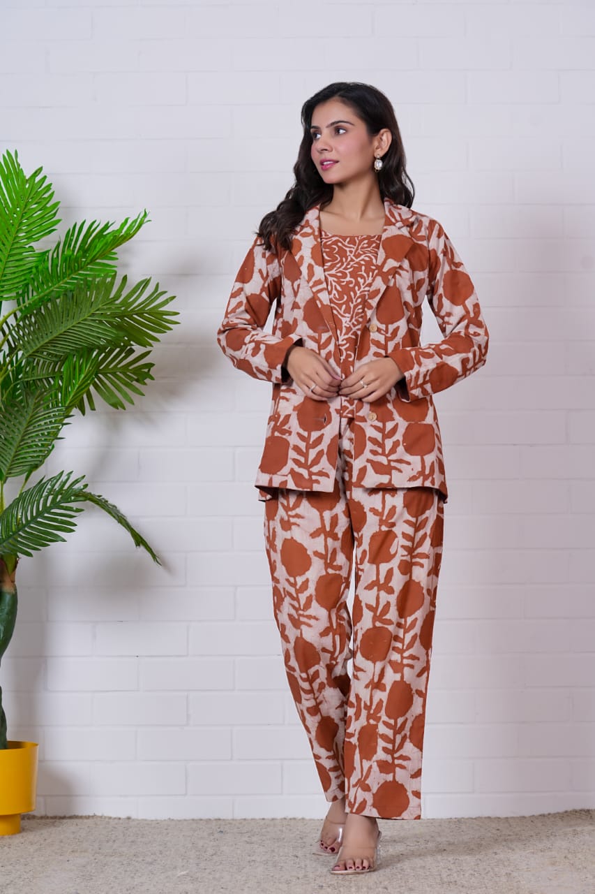 This handcrafted 3-piece ensemble features a hand block printed double-layer jacket, coordinated pants, and a soft printed inner, designed to blend tradition with a modern relaxed silhouette.