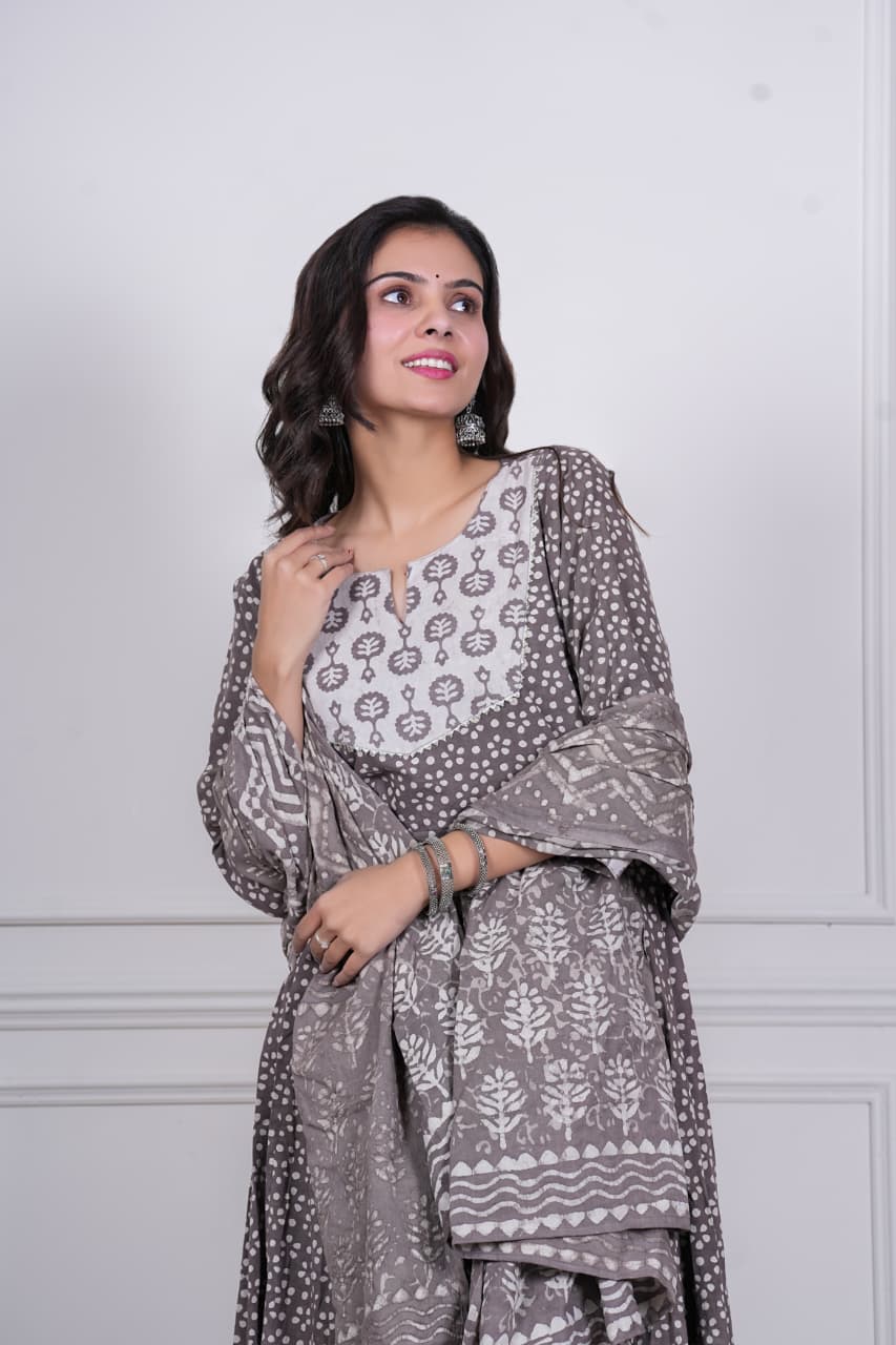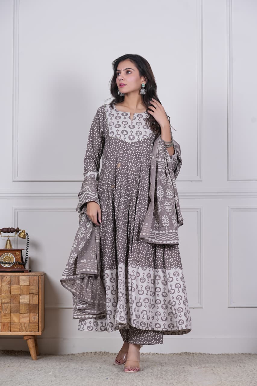 Inspired by nature’s calm tones, Vasudha is a hand block printed Anarkali set designed for timeless elegance and everyday comfort. With its earthy taupe base, ivory accents, and intricate hand block motifs, this ensemble brings together heritage artistry and modern grace.