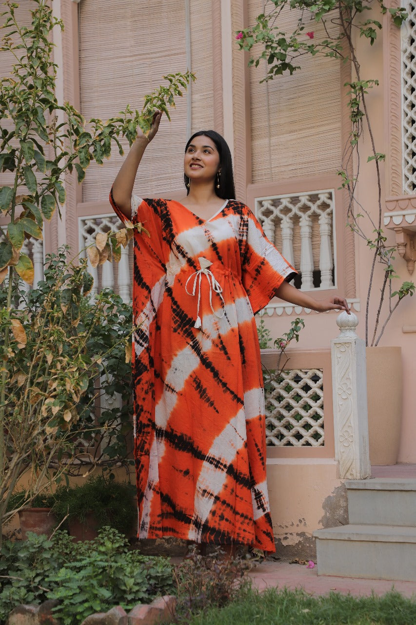 Turn heads with this Vibrant Tie-Dye Kaftan in fiery sunset orange, a striking piece that perfectly captures free-spirited elegance. Made from soft, breathable cotton, this kaftan offers a relaxed silhouette while still giving you a flattering shape thanks to its adjustable drawstring waist.