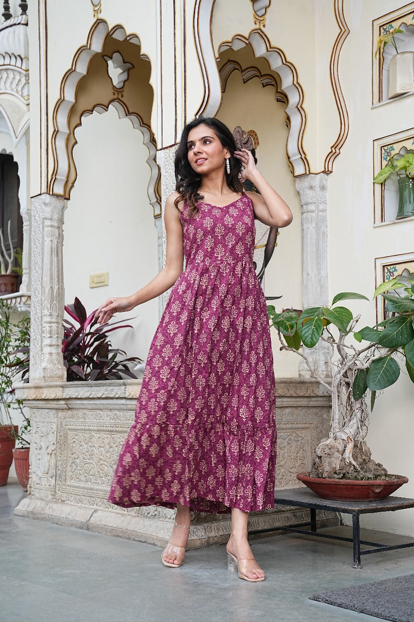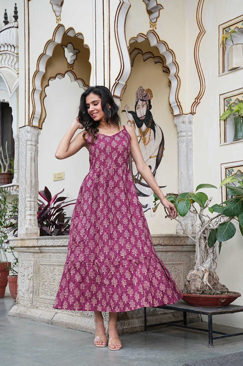 A symphony of elegance and tradition, the WINE FLORAL BLOCK PRINT LONG DRESS brings timeless Indian artistry to contemporary comfort.